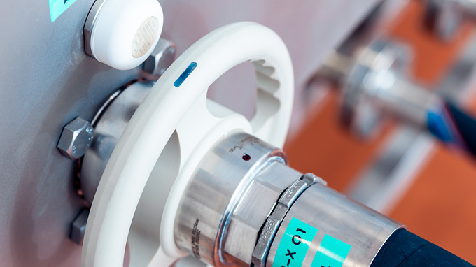 The three RFID tags in each coupling wheel ensure that they are read quickly and reliably. The IN TAG 200 tags used are specially designed for use in potentially explosive atmospheres. The TN-EM30WD-H1147-EX read/write head used is also approved for potentially explosive atmospheres up to ATEX zone 2. Its stainless steel and liquid crystal polymer housing meets protection class IP69K and withstands even the harshest cleaning processes.