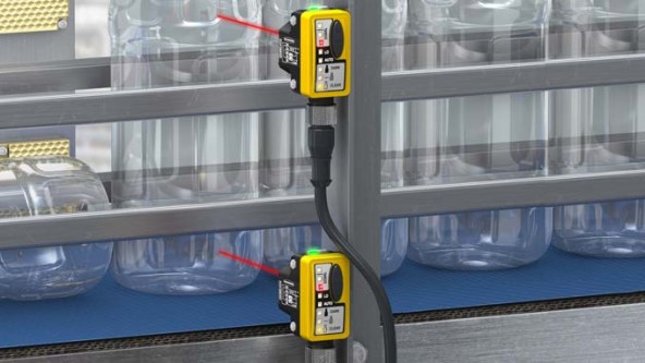 Banner Engineering solved the application with a pair of QS30ELVC clear object detection retroreflective sensors, which are ideal for detecting clear bottles and alerting operators of tipped bottles. One lower sensor is positioned to detect the bottles and one sensor is positioned at the top to detect if the bottle is upright.