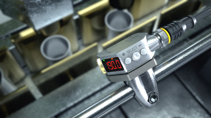 The Q4X laser sensor from Turck's opto-sensor partner Banner Engineering reliably detects even shiny objects like these sheet metal cylinders. Within 10 milliseconds, the sensor detects missing or incorrectly positioned cans.