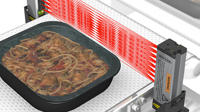 Banner Engineering’s LX Series is an economical solution for detecting the leading edge of flat objects, such as the frozen dinner containers. With a web of modulated light, the LX Series part-sensing light screen can detect any item—in any position—passing through the light screen.