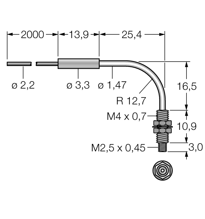 - End sleeve for probe, angled (90°) M2.5 x 0.45 threaded